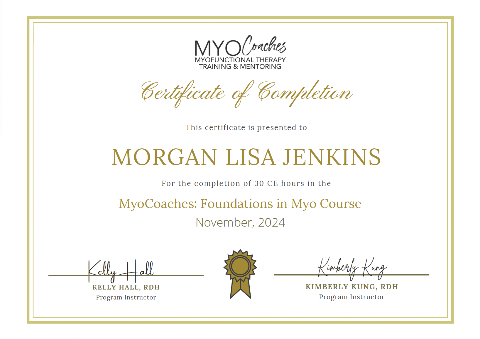 In 2024 she trained in Myofunctional Therapy so that she could provide support and understanding for her patients suffering from myofunctional disorders.